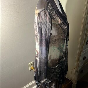 This elegant blouse features a tie front design and a relaxed fit, perfect for a chic and comfortable look. The gray and silver color scheme adds a touch of sophistication to any outfit. Full zipper in the front. Fabric is beautiful and very sheer. Size Large. 34” in front37” in back length. 17” pit to pit. This is a very good brand.
