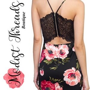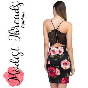 Let's get out this summer and nock out the errands in this beautiful floral mini dress! just pair with some sandals and bracelets and you are sure to have a casual look while looking beautiful. Featuring flowers on two different color dresses, a v-neckline, spaghetti straps, and a back lace detail with exposed zipper. This is the perfect casual floral dress for your summer day!