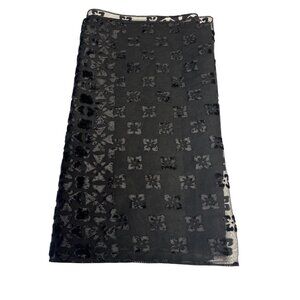 This scarf features a sheer black fabric with an intricate floral pattern, adding elegance to any ensemble. Light and versatile for various occasions.
