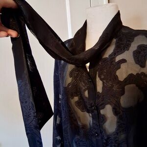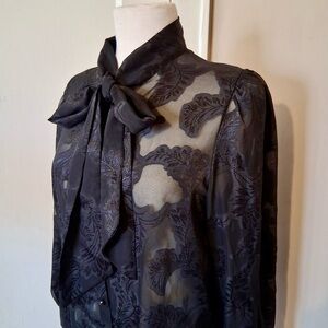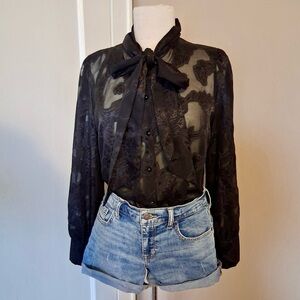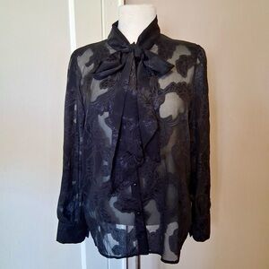 In great pre-owned condition. No stains or rips. Beautiful sheer blouse with floral print. Buttons down the front and ties around the neck. No brand tag.