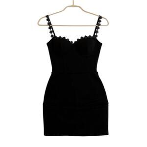 Turn heads in this flirty and feminine Commense mini dress, brand new with tags. Made with a curve-hugging slim fit, this sleeveless black dress features delicate floral appliqué along the straps and neckline for a soft, romantic edge. Crafted from a comfortable fabric with a slight stretch, it shapes beautifully to your figure while remaining breathable.