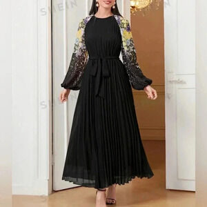 Black Floral pleated Maxi Dress with belt . Size Medium
