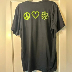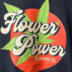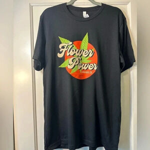 Black T-shirt with a bold, retro-inspired graphic on the front that reads "Flower Power" in stylized lettering. The design includes a bright red circle as the background with green cannabis leaves incorporated into the graphic, giving the shirt a vintage, counterculture vibe reminiscent of the 1960s. The back of the T-shirt features three symbols in neon green: a peace sign, a heart, and a flower, further emphasizing the shirt's nostalgic and playful theme. The T-shirt has a casual, relaxed fit and is perfect for those who appreciate vintage-inspired fashion or want to make a statement with their clothing. The combination of the bold front graphic and the vibrant symbols on the back make this shirt a standout piece.