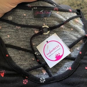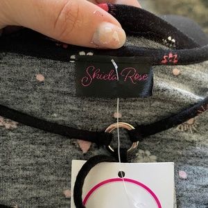 Shiela Rose - Black Flower and Heart Long Sleeve Top w/ Strappy Neck Design with Silver Ring Accent (as pictured).