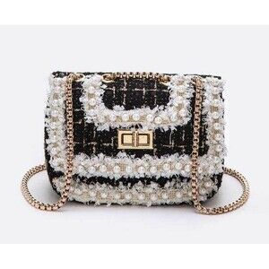 Black Fluffy Trendy Tweed Fuzzy Iconic Swing Bag Ladies Chain Satchel