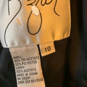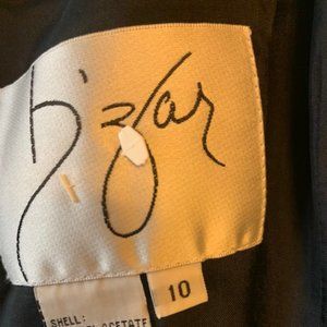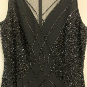 Black beaded gown by Bizar. Beautiful detail with beading to the hips. The front of the gown has more beading than the back, as shown in the pictures. The back will need repair of the beads near the zipper. Otherwise, dress is in great condition. Length from armpit to hem: 51"