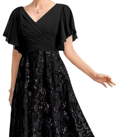 Black Formal Plus 28W Sparkly Sequin Lace Dress Long Pleated V-Neck
