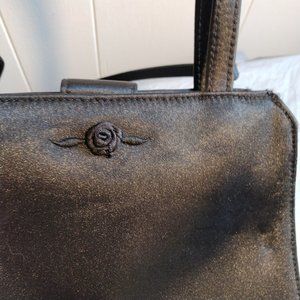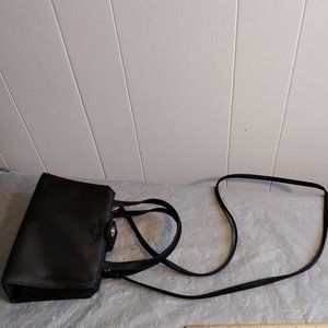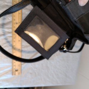 8 1/4"W, 5 1/2"H, 2 3/4"D. 29" strap drop. Strap can be removed and used as a handbag. Black satiny fabric. There is a two sided piece attached to a cord that pulls out. ID holder on one side and mirror on the other. This is pre owned and looks never used.