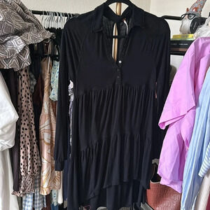 Black Free People Dress Women's Medium Black Tiered Mini Rayon Linen Long Sleeve