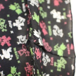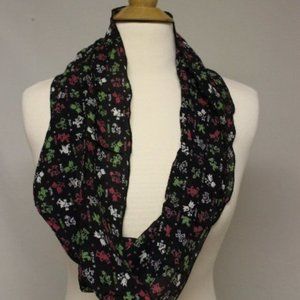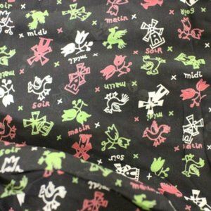 New, handmade black chiffon circle scarf. Features flowers, chickens, and windmills in white, pink, and green, along with "matin, soir, and midi", French for "morning, afternoon, and evening."