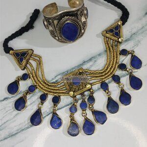 Elevate your style this season with the perfect blend of vintage elegance and bohemian charm. This stone-embellished choker necklace and cuff set showcases intricate detailing, earthy tones, and a timeless appeal.