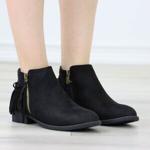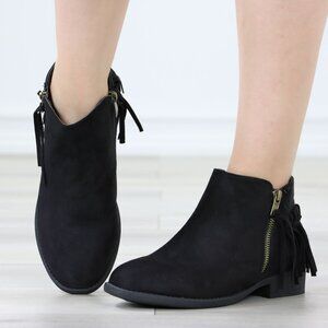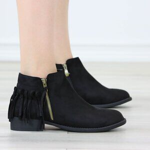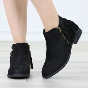 Black Fringe Ankle Boots Gold Zipper Low Block Heel Faux Suede Casual Shoes