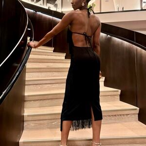 Black Fringe Backless Halter Dress