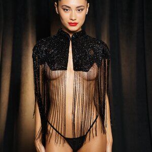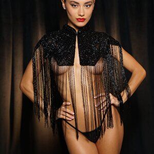 Black Fringe Cape, Beaded Rhinestone Shawl, Luxury Sequin Cape