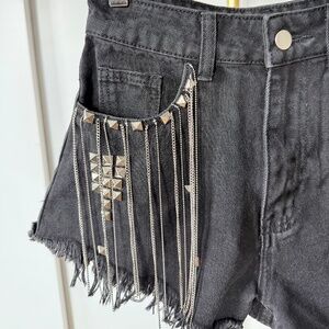 Edgy black denim shorts with distressed hem and silver fringe + stud detailing on the front pockets. Statement piece for your summer outfits. Fringe chains can be tucked into the pockets for a different look - see last photo.