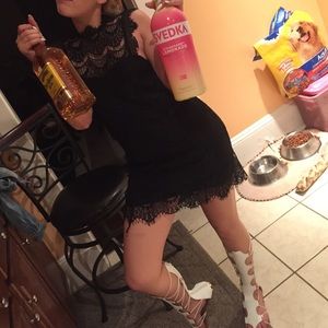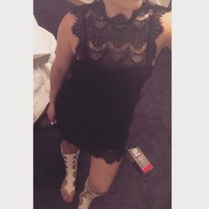 Black fringe dress with open back. comes up high on neck with lace. buttons in back of neck, beautiful dress Worn ONCE
