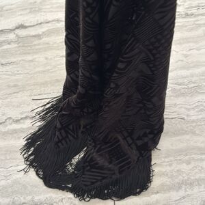 This is the most AMAZING fringe top!! The body of the top is a black burnout velvet in a geo pattern. It’s slightly relaxed and drapey. Fringe from shoulders down and all across the bottom. It is SO cute. Perfect for festivals!