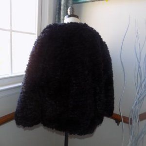 Black Faux Fur Coat Size Medium Hook Closure Lined Collarless Very Warm 3/4 Sleeve