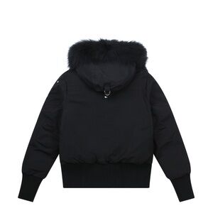 Stylish black jacket with fur-trimmed hood. Features a zip closure and pom-pom details.