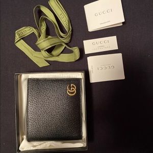 Textured calfskin bifold wallet in black. Antiqued gold-tone logo hardware at face. Eight card slots, two patch pockets, two note slots, and logo embossed at interior. Tonal textile lining. Approx. 4.25" length x 3.5" height x 0.5" width. NEW IN BOX!