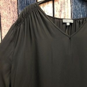 The Limited brand size 1X high low top, new with tags. Black V neck long sleeve blouse with gathered cuffs. Brushed silver buttons on the sleeves, gathered details along the shoulders and neckline around the back. This has a nice flow to it and is great for wearing black as the weather gets warmer.