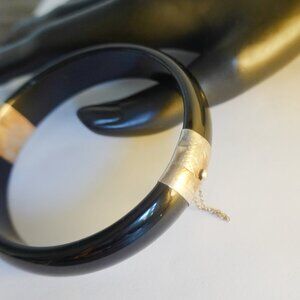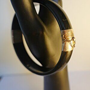 vintage genuine black jade hinged bangle bracelet- fits average wrists gold filed endings