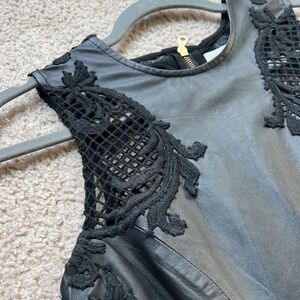 Black Genuine Leather Fit n Fare Mini Dress Lace Applique Exposed Gold Zipper XS