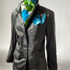 The leather in this jacket is so soft you will fall in love with it. Notice the longer length sleeves, great styling and fit. It is a size medium.