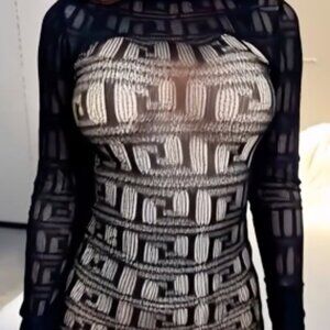 Black Square Geometric Pattern Bodycon Long-Sleeve Fishnet Cover-Up Dress