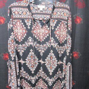 Black Geometric Pattern Boho Tunic with Lace Trim