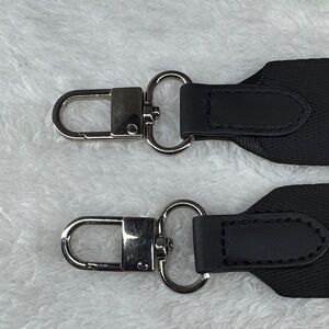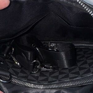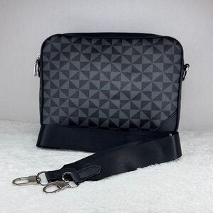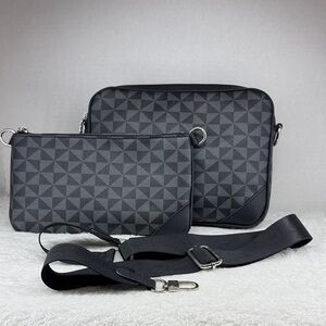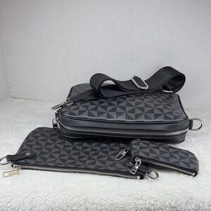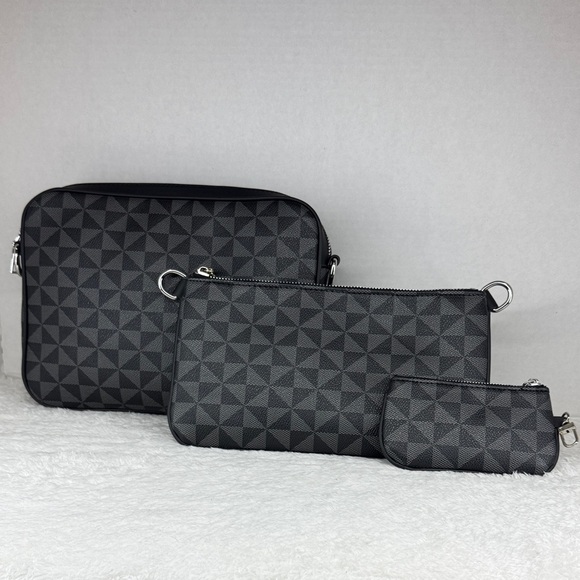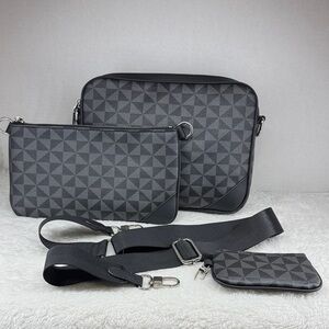 Stylish black bag set with a geometric pattern. Includes three pieces with silver hardware.