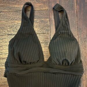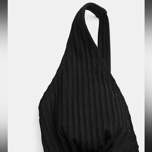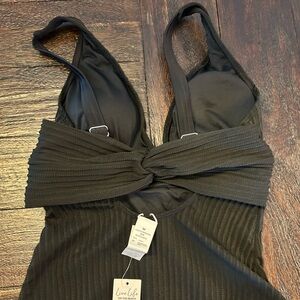 Make a bold statement in our Black Ribbed Plunging One-Piece! The plunging V-neckline and wide straps create a stylish and confident look, while the removable soft cups provide a comfortable fit with light bust support. With modern bum coverage, this swimsuit is a perfect combination of fashion-forward design and comfort.
