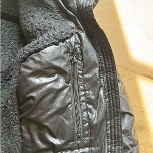 Cozy and stylish black puffer jacket. Features a warm hood and zippered pockets. Ideal for cold weather. Fleece interior