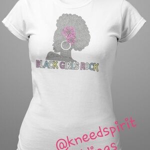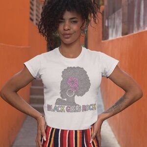 Black Girls Rock Tee with a beautiful silhouette and Multicolored bling lettering. Available in a white, crew neck tee.