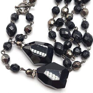 This elegant black glass beaded necklace showcases a stunning faceted teardrop pendant, making it an ideal accessory for enhancing evening wear. Its 29-inch length offers versatility for various necklines. The toggle clasp ensures secure and comfortable wear.