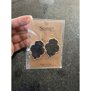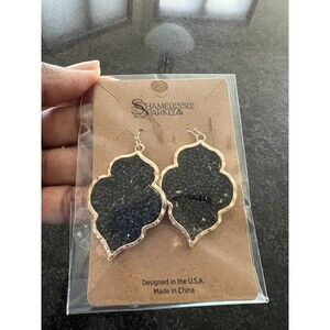 Make a dazzling statement with these elegant Black Glitter Pave Rhinestone Moroccan Drop Earrings. These exquisite earrings feature a unique Moroccan-inspired design, adorned with shimmering black rhinestones set in a glittering pave pattern. The gold plated dangle adds a touch of luxury and sophistication, making these earrings perfect for any special occasion or adding a bit of glamour to your everyday look.