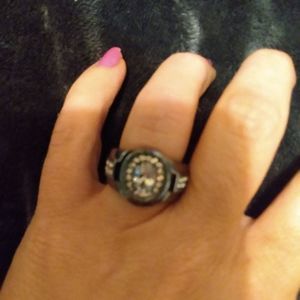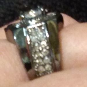 It is a ladies size 7, black gold filled, fashion ring featuring a large, oval, cubic zirconia center stone, surrounded by smaller, sparkling CZ baguettes. Smaller, still, are the tiny CZ stones encrusted in the band, on either side of the setting.