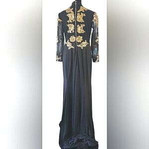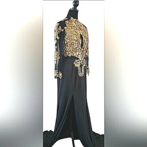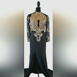 New With Tags Women's Medium Black Gold Sequin Sparkling Appliqués Side Slit Back Zipper