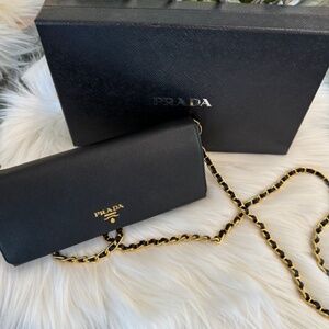 Beautiful Black & Gold Prada Saffiano Leather Wallet on Chain with original box. Was a truly thoughtful gift, but never used. Perfect condition - still has the paper protector inside! Measures 8.25" by 4.25" by 1".