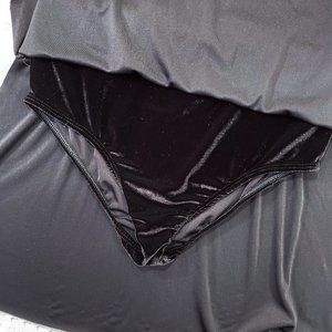 Black velvet costume dress with sheer stomach panel, high side slits, spaghetti shoulder straps, and metallic gold accents. Built in panties.