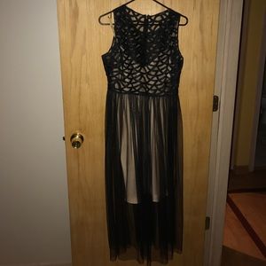 Black & gold sheer dress. Formal. Was worn once to a wedding. Beautiful design. Gold slip is unattached and came that way. Slip is almost knee length. Black dress is almost ankle length.