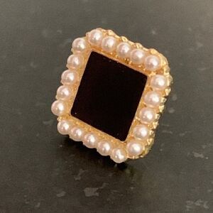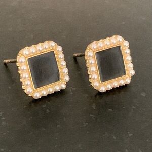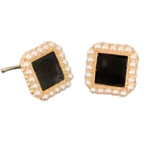 Black & Gold Square Studs with Faux Pearl Border, French Vintage Style Earrings