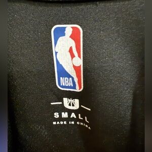 Black t-shirt featuring the NBA logo. Gold, blue, and white accents.