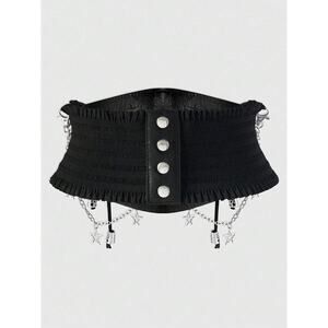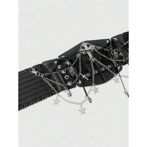 Elevate your gothic aesthetic with this Black Gothic Corset Waist Belt, blending punk attitude with celestial charm. This intricately detailed waist cincher features a faux leather construction, silver hardware, and a mix of gothic cross and star charms draped across layered chains for a look that demands attention.