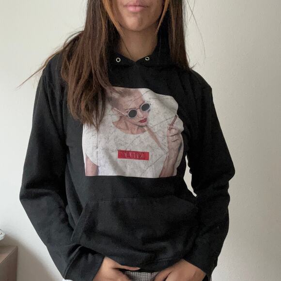A stylish black hoodie featuring a striking graphic print. This comfortable pullover sweatshirt is perfect for adding a touch of edgy flair to your casual wardrobe. The hoodie includes a classic kangaroo pocket and an adjustable drawstring hood, making it both practical and fashionable. Ideal for weekend outings, casual hangouts, or adding a cool layer to your everyday look.