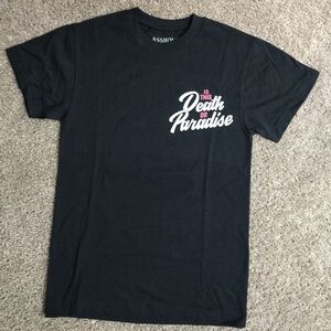 Assholes Live Forever, men's size small Black tee featuring a vibrant skeleton graphic with palm trees and a pool. Bold words and personality add a unique touch. All questions welcome.