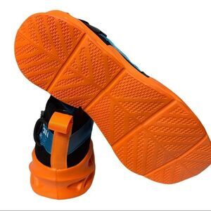 Black lightweight sock style elastic band lace pull tab orange EVA rubber sole sneakers.