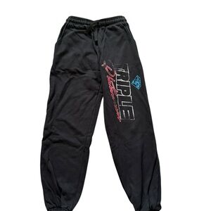 These black sweatpants feature a vibrant graphic design spelling 'RULE' on one leg, adding a bold touch to their sleek appearance. Made from a soft cotton blend, they offer comfort and style with an elastic waistband and tapered ankle cuffs.