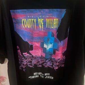 Black MARCELO BURLON t-shirt featuring a bold graphic writing..,Eye-catching design with vibrant colors. SIZE LARGE IN EXCELLENT CONDITION.. ARMPIT TO ARMPIT 22