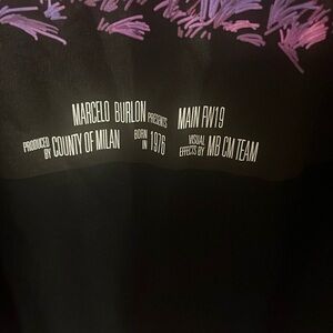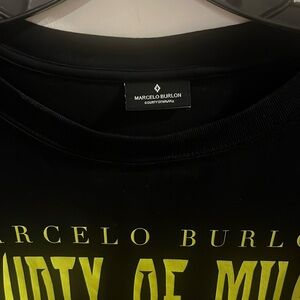 Black MARCELO BURLON t-shirt featuring a bold graphic writing..,Eye-catching design with vibrant colors. SIZE LARGE IN EXCELLENT CONDITION.. ARMPIT TO ARMPIT 22